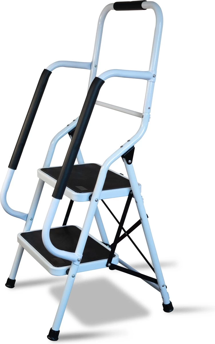 De opstapkruk met leuning is een veelzijdige opstap die zowel binnen als buiten kan worden gebruikt, ideaal voor schoonmaken, het uitvoeren van huisrenovaties, doe-het-zelf-klussen en het bereiken van moeilijk bereikbare plaatsen. Het opvouwbare ontwerp zorgt voor eenvoudige opslag en past op smalle plaatsen. Het lichtgewicht en dichte ontwerp zorgen voor gemakkelijk vervoer tijdens het gebruik. Deze trapladder heeft een veilig en stevig ontwerp. De antislip brede pedalen geven gebruikers een evenwichtig gevoel, en de rubberen hulzen beschermen uw vloer tegen krassen en verminderen de kans op uitglijden. De rubberen leuning zorgt voor extra grip. Verkrijgbaar als 2 of 3 treden model.