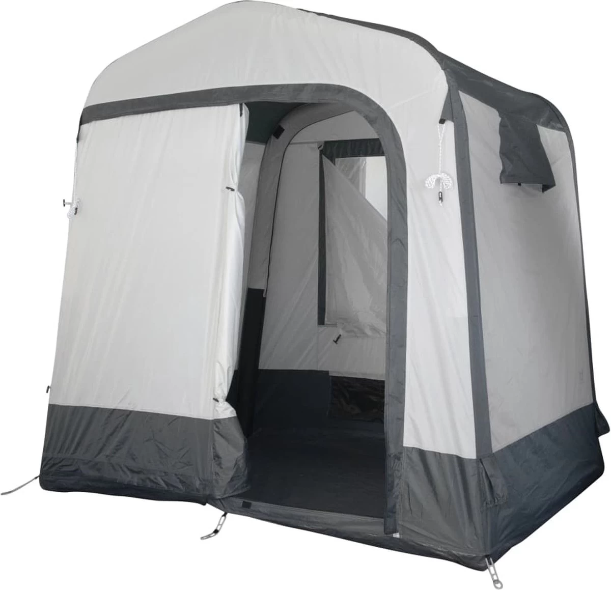 Een luxe opblaasbare grote opbergtent van extra dikke stof. Multifunctionele tent die compact is mee te nemen en makkelijk is op te zetten met een meegeleverde pomp met manometer. Gemaakt van stevig en luxe polyester met een waterdichte PU coating (waterkolom van 2000 mm) en een waterdicht grondzeil (waterkolom van 3000 mm). Ideaal voor het stallen van fietsen en/of opbergen van spullen. De tent wordt compleet geleverd met scheerlijnen, haringen en transporthoes en een pomp met manometer.