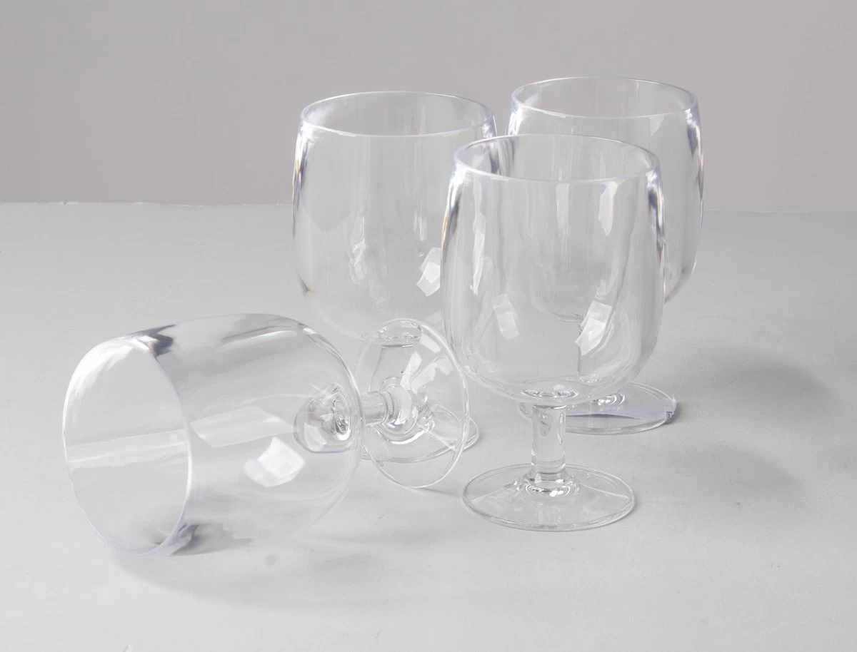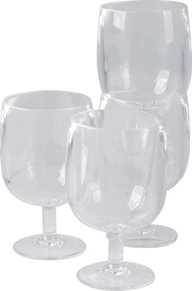 Een set van 4 compact stapelbare wijnglazen. Gemaakt van sterk kunststof, vrijwel onbreekbaar en lichtgewicht. Tevens BPA vrij.