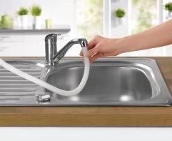 Spoelen: vul met koud of lauwwarm water, zet de timer en druk op de knop wassen. Daarna laat je het water via de afvoerslag weglopen.