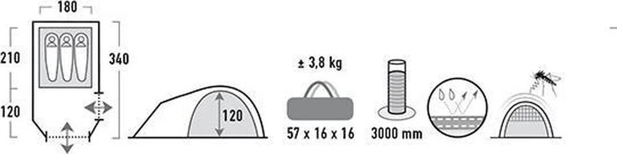 De praktische voorbouw biedt veel bergruimte en de weerbestendige ingang zorgt ervoor dat het slaapgedeelte ook droog blijft bij erg slecht weer. De funktionele, zijwaarts te openen ingang zonder hoogteverlies, laat zich makkelijk opzij oprollen Via de zijdeur kunt u de slaapplaats van twee kanten betreden of verlaten. De naden zijn getapet om lekkages te voorkomen. De tent is verder uitgerust met heldere folievensters en 2 permanente ventilaties die in alle weersomstandigheden zorgen voor een continue luchtstroom. Hou de ventilaties daarom ook altijd open voor een doeltreffende werking. De neongroene afboordingen, scheerlijnen en stokken blijven ook in de avondschemering goed zichtbaar. De zeer stabiele 5 mm staal-grondpennen gaan niet buigen bij een harde ondergrond.