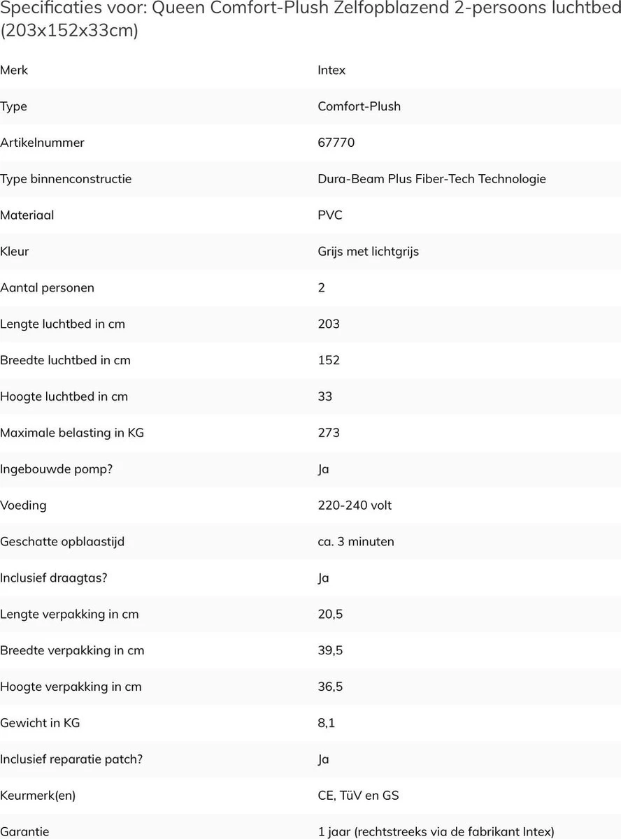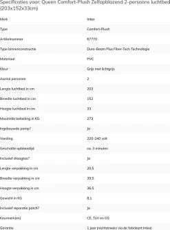 Het Intex Comfort-plush Full Luchtbed is een verlaagd, extra sterk en comfortabel luchtbed. Het luchtbed is voorzien van een duizenden sterke polyester vezels waardoor hij sterker en comfortabeler is dan normale PVC luchtbedden. Dankzij de ingebouwde pomp is hij snel opgeblazen waardoor het luchtbed geschikt is voor een logeerpartijtje of kampeervakantie.