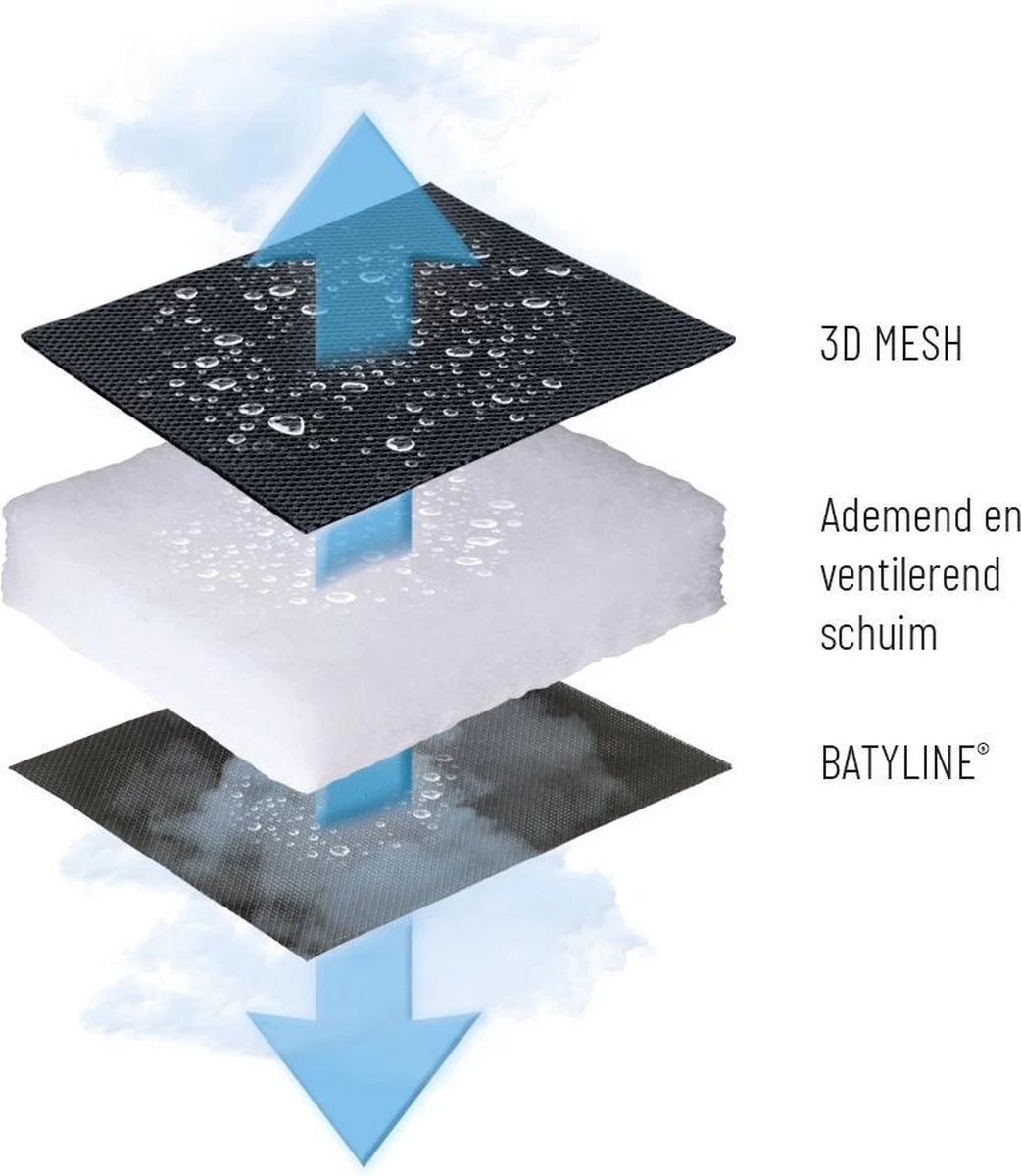 – Air Comfort®-kussen: 100% comfort, en dat is niet het enige: door een combinatie van ademende en waterdichte materialen houdt het geen water vast, wordt de luchtcirculatie bevorderd en droogt het extra snel.