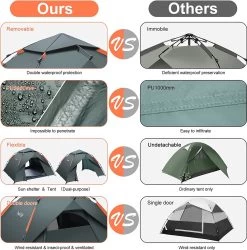 - 2-in-1 multi-use tent: this two-layer instant mount tent contains a detachable external and internal tent and can be used for very different purposes. As a whole, it can be used as a windproof and rainproof camping tent. The outer tent tarpaulin can be used as awning, outdoor tent tarpaulin, pavilion, awning and protective roof.
