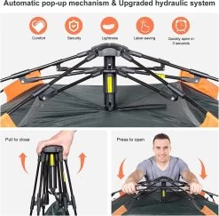 - Pop-up tent for easy use: this automatic hydraulic system allows you to set up the tent within a minute. The most modern tent with outer tent tarpaulin features a more revolutionary design than a regular tent. Pre-applied, stable rods and a light structure make the building process simple and efficient, allowing you to fully enjoy your holiday in the open air.