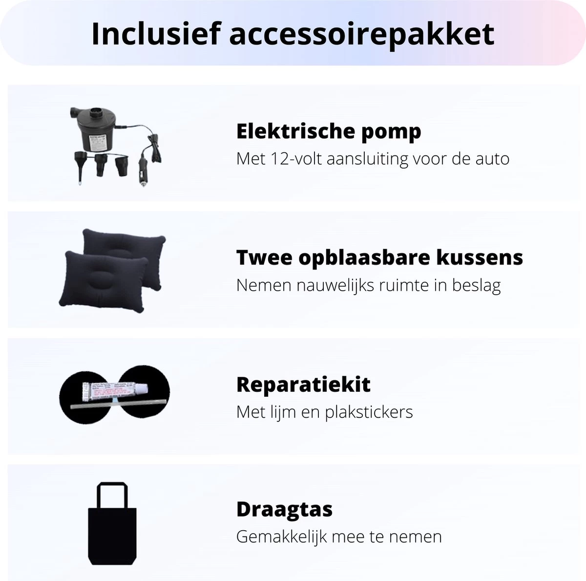 Het opblaasbare tweepersoons luchtbed is erg slijtvast en komt met een compleet accessoirepakket, bestaande uit een elektrische pomp, twee hoofdkussens, een draagtas en een reparatiekit. Vanaf nu is een slechte nachtrust in je auto verleden tijd.