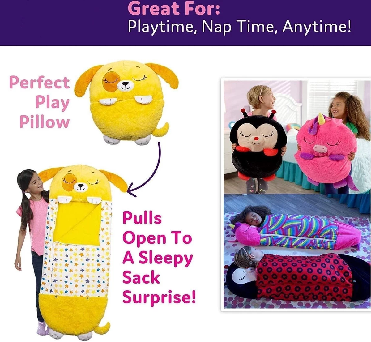 Vrolijke slaapzak voor kinderen: speelkussen slaapzak in een paar seconden verander je van een speels speelkussen in een draagbare speelslaapzak met geïntegreerd kussen. Ideaal om te overnachten met familie of hereniging met familie